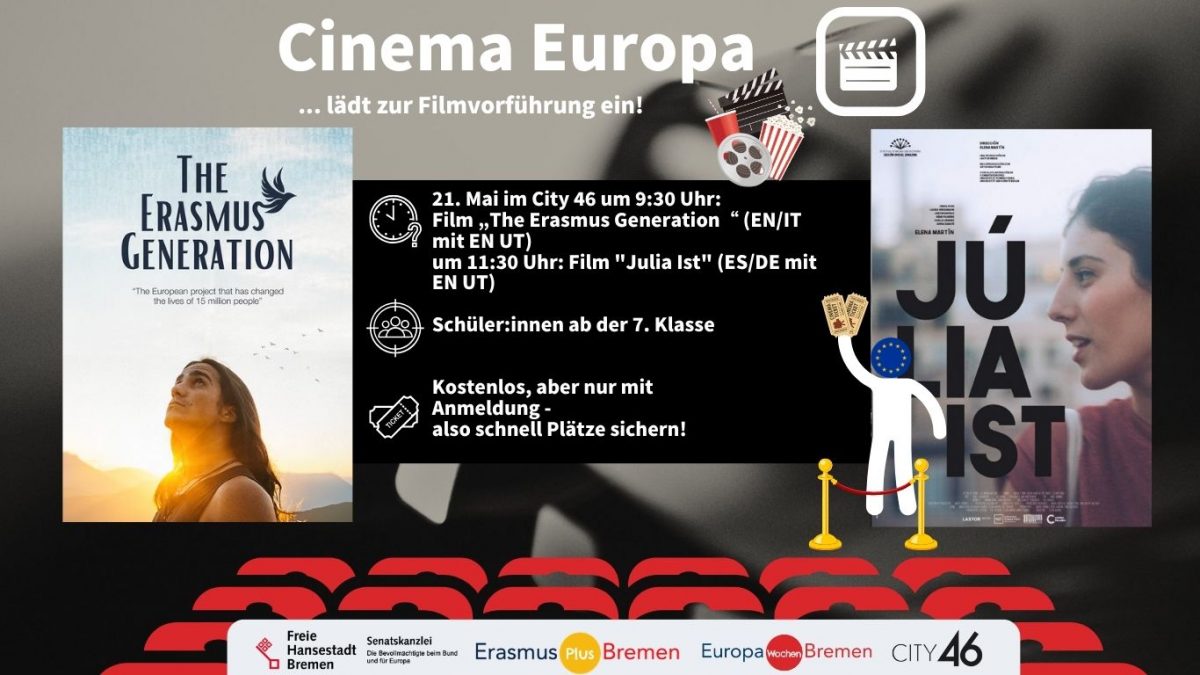 Auch dieses Mal kooperieren wir mit dem City 46/ Kommunalkino Bremen e.V. und bieten euch und euren Schüler:innen ein Erasmus-Kino. Am 21. Mai ab 9:15 Uhr zeigen wir den Film „The Erasmus Generation“. Im Anschluss, um 11:30 Uhr, zeigen wir dann den Film “Julia Ist”. Der Film richtet sich vor allem an Lehrkräfte und Schulklassen, doch auch interessierte Privatpersonen sind herzlich willkommen. Der Eintritt ist kostenlos, jedoch bitten wir um vorherige Anmeldung, da die Plätze begrenzt sind. Über die Filme: “The Erasmus Generation”(EN/IT mit EN UT, empfohlen ab 7. Klasse) Roberto ist einer von 15 Millionen Menschen, die in den 35 Jahren des Bestehens das Erasmus-Programm erlebt haben. Vor dem Austausch war Roberto neugierig, aber auch unsicher, was ihn erwarten würde. Während des Youth Exchange lernte Roberto Jugendliche aus verschiedenen Ländern kennen. Sie arbeiteten gemeinsam an Projekten, diskutierten über europäische Themen und entdeckten Gemeinsamkeiten und Unterschiede. Nach dem Austausch berichtete Roberto, dass Erasmus sein Selbstvertrauen gestärkt und seine Sicht auf Europa verändert habe. Er fühlt sich nun als Teil einer größeren Gemeinschaft und ist motiviert, sich weiterhin für den europäischen Austausch und das Miteinander einzusetzen. Erasmus zeigt, wie persönliche Begegnungen über Grenzen hinweg nicht nur das Leben Einzelner bereichern, sondern auch den europäischen Gedanken stärken und den Frieden fördern. Hier findest du den Trailer “The Erasmus Generation”. “Julia Ist” (ES/DE mit EN UT, empfohlen ab 8. Klasse) Júlia befindet sich allein in einer kleinen Wohnung, umgeben von ungeöffneten Kisten und einer Stadt, die ihr noch fremd ist. Die Tage vergehen langsam, zwischen Vorlesungen auf Deutsch, die sie kaum versteht, und Spaziergängen durch endlose Straßen, in denen die Kälte bis auf die Knochen geht. Sie vermisst das warme Treiben Barcelonas, die Sonne im Gesicht und die vertrauten Gespräche. Doch nach und nach entdeckt sie kleine Zufluchtsorte: ein gemütliches Café in der Nähe der Universität, einen Park, in dem die Bäume dem Winter trotzen, und einige Kommilitonen, die – wie sie – ihren Platz in Berlin suchen. Auch wenn die Sehnsucht sie begleitet, beginnt Júlia zu verstehen, dass das Abenteuer nicht immer so ist, wie sie es sich erträumt hat, sie aber gerade in diesen Unterschieden neue Wege finden kann, zu wachsen und sich zuhause zu fühlen. Hier findest du den Trailer “Julia Ist”. Ihr wollt mit eurer Schulklasse, eurer Jugendgruppe oder als Einzelperson dabei sein? Meldet Euch über unter “hier anmelden” schon jetzt an und sichert euch eure Plätze! Wir freuen uns auf euch! |